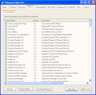 Privacy Eraser Pro is an Internet Eraser that protects your Internet privacy by cleaning up all the tracks of Internet and computer activities. Our Internet Eraser supports popular web browsers such as Internet Explorer, Mozilla Firefox, Google Chrome, AOL, Opera and MSN Explorer. Privacy Eraser Pro supports free plug-ins to extend cleaning features, you can easily erase the tracks left by any applications and make your own plug-ins. We currently offer more than 250 FREE plug-ins which supports the most popular programs such as ACDSee, Acrobat, Microsoft Office, KaZaA, Real Player, Media Player and many others. Privacy Eraser (Pro) supports Microsoft Windows FAT/FAT32/NTFS file systems, completely implements and exceeds the US Department of Defense DOD 5220.22-M and NSA clearing and sanitizing standard, to gives you confidence that once erased with Privacy Eraser (Pro) your file data is gone forever and can not be recovered.